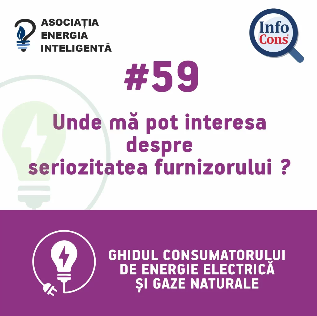 Cum aflu care este furnizorul meu actual de energie electrică ? – InfoCons protectia consumatorilor de energie   Pe factura de energie electrică emisă periodic vei găsi numele societății care furnizează energia electrică, împreună cu datele de identificare ale locului de consum.     GHIDUL CONSUMATORULUI DE ENERGIE ELECTRICĂ ȘI GAZE NATURALE poate fi accesat AICI
